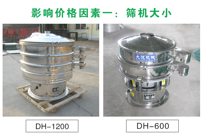 煙草振動篩分機的型號大小有多種(DH-400、DH-600、DH-800、DH-1000、DH-1200、DH-1500、DH-1800等)不同的型號大小所配置的振動電機與價格也是不同的,每個型號之間相差幾百到上千元不等。