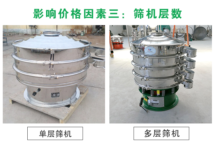煙草振動篩分機材可安裝1-5層篩網,可同時進行2~6個等級的分選或過濾,不同的層數有著不同的篩分目的,單層只能簡單的篩分過濾,多層則可以完成分級除雜等篩分效果。安裝多層篩網的肯定會比單層篩網的貴一些。差價在1000元以上。